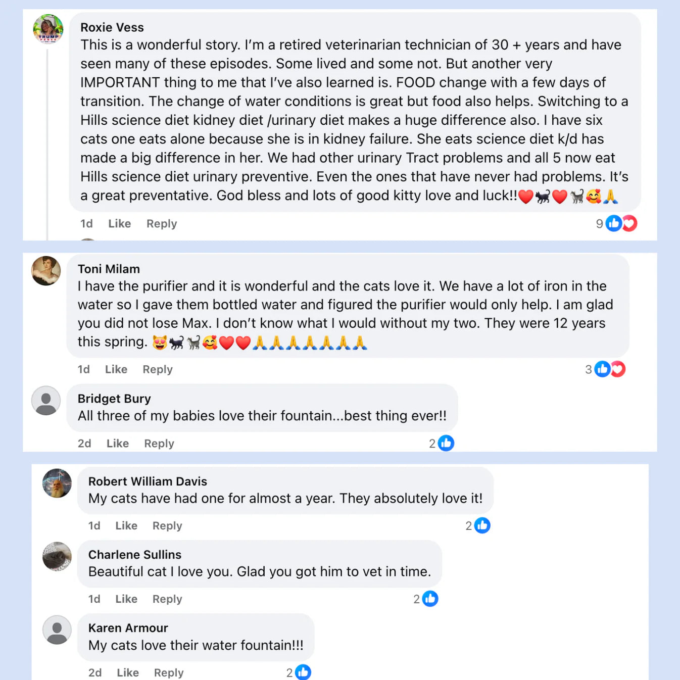 I have purchased a couple fountains from big box pet stores in the past and each time the price tag was higher and the product wither never worked or worked for a short time. I was nervous purchasing this product due to expecting low quality for low price but I am very happy with this product. The stainless steel puts me at ease about excess bacteria in between washes. It could not be simpler to set up and refill. And the cats love it. They drink much more water since they got this. I also like that it holds a good amount of water without taking up too much space.